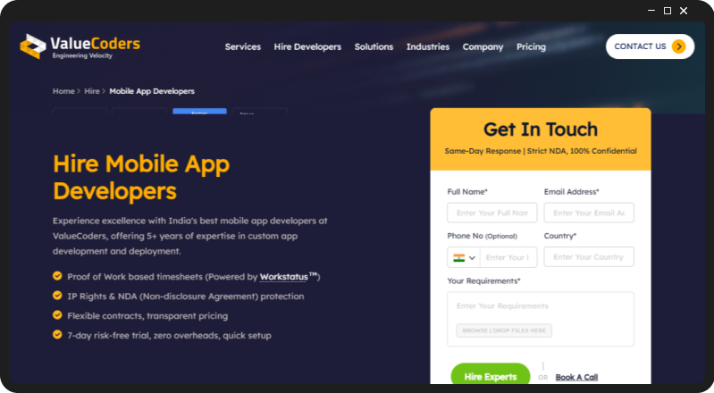 ValueCoders has also been serving the industry for a long time and has served a large number of businesses by helping them develop solutions they have wanted. Mobile app developers at ValueCoders utilize the latest technology, making the solution future-proof and reliable. Whether you are looking for native mobile apps for Android and iOS or want to develop a cross-platform mobile app, developers at ValueCoder can meet your specific development needs and help you achieve desired results.