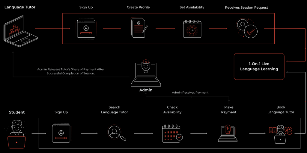 The business model of Preply revolves around connecting students and tutors for their language learning requirements. The platform matches students with the tutors as per their preference. Here is the workflow of an online language learning platform like Preply.
