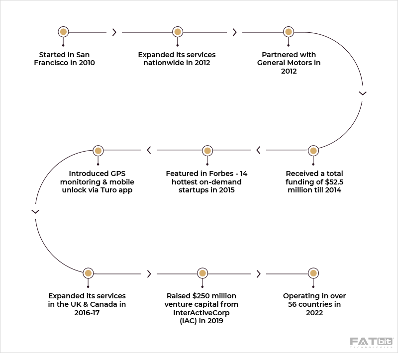 Launched in the year 2010 under the name RelayRides, Turo is a P2P car rental platform with a current fleet size of over 350,000 cars. In its overall existence of more than a decade, Turo has accomplished the following milestones:
