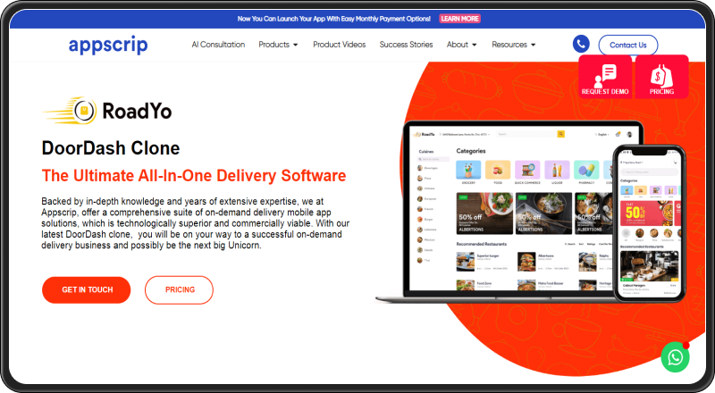 Appscrip is a fully customisable clone script that facilitates the quick launch of your food delivery app. It is well-known for reducing time to market with its pre-built solutions, such as the Dordash clone app. The clone script provider offers experienced and well-performing pre-built solutions that are also built to scale in the long run. Appscrip has not revealed the clone script pricing.